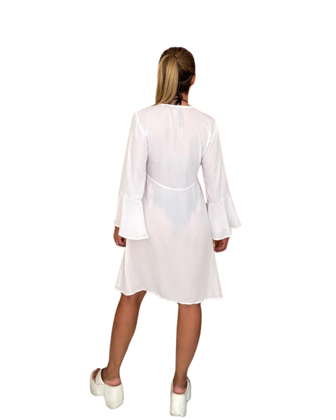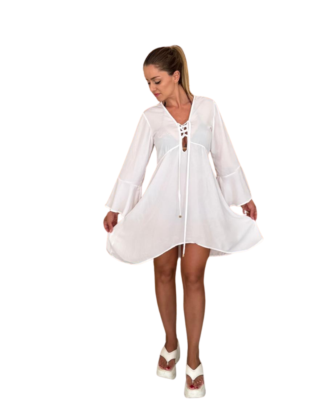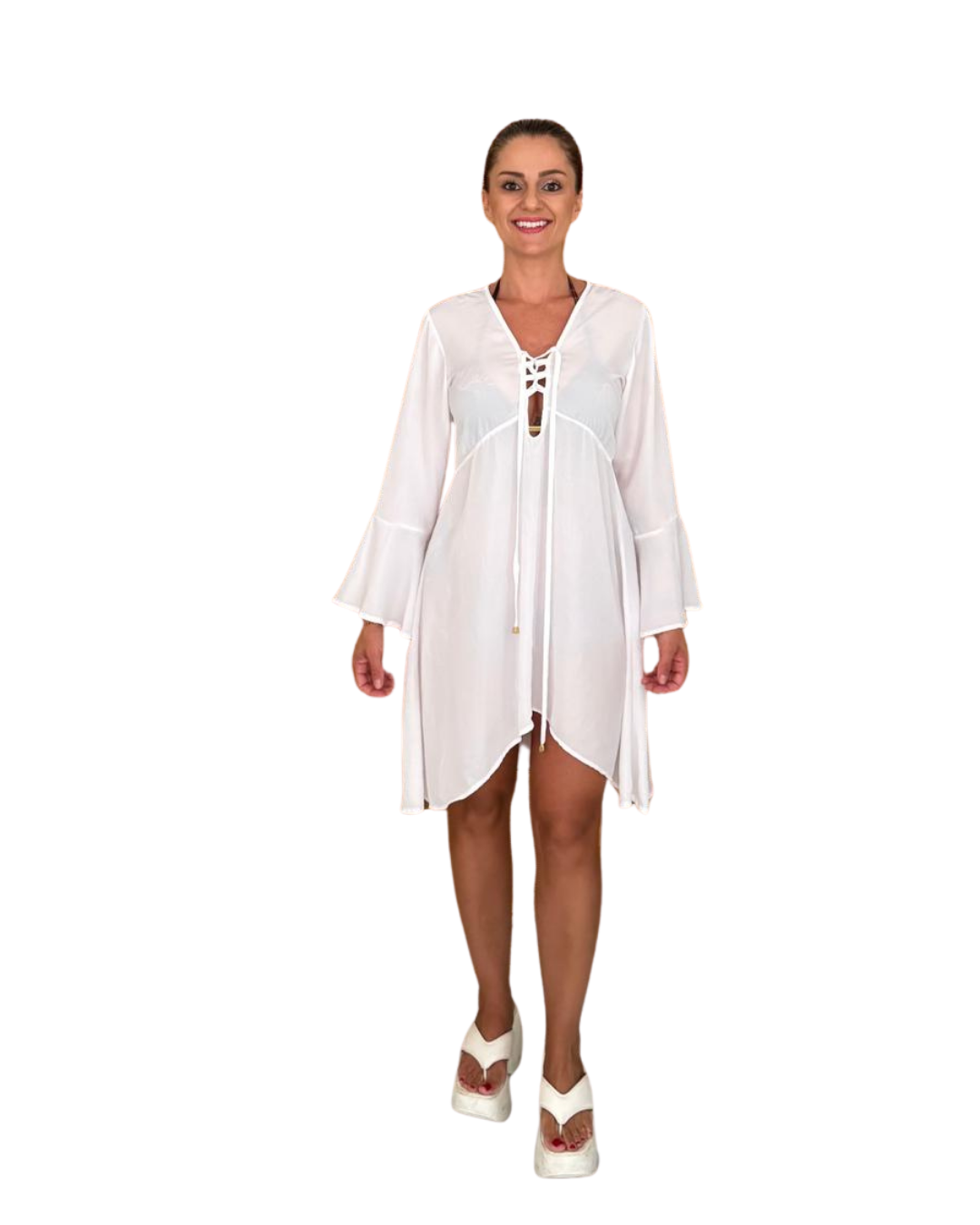 Il design ampio e fluido garantisce libertà di movimento, mentre il colore bianco dona un tocco di freschezza ed eleganza. Le maniche ampie e il taglio svasato rendono questa tunica adatta a ogni tipo di fisicità, valorizzando la silhouette con semplicità.